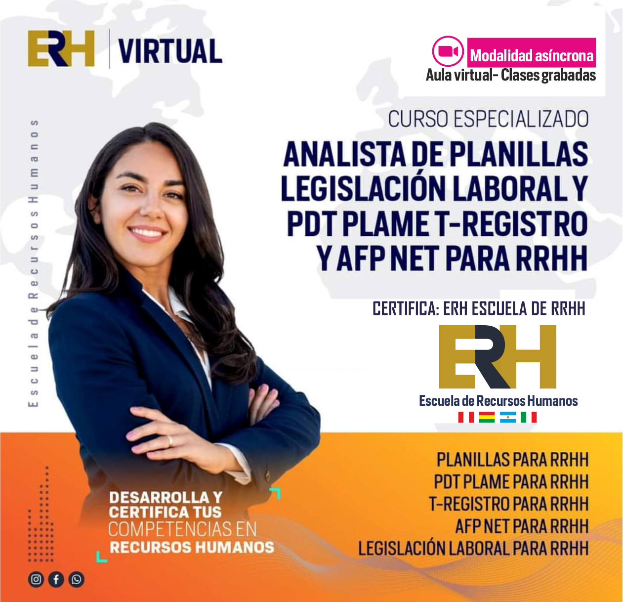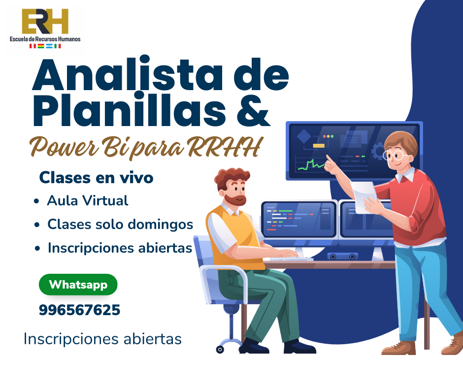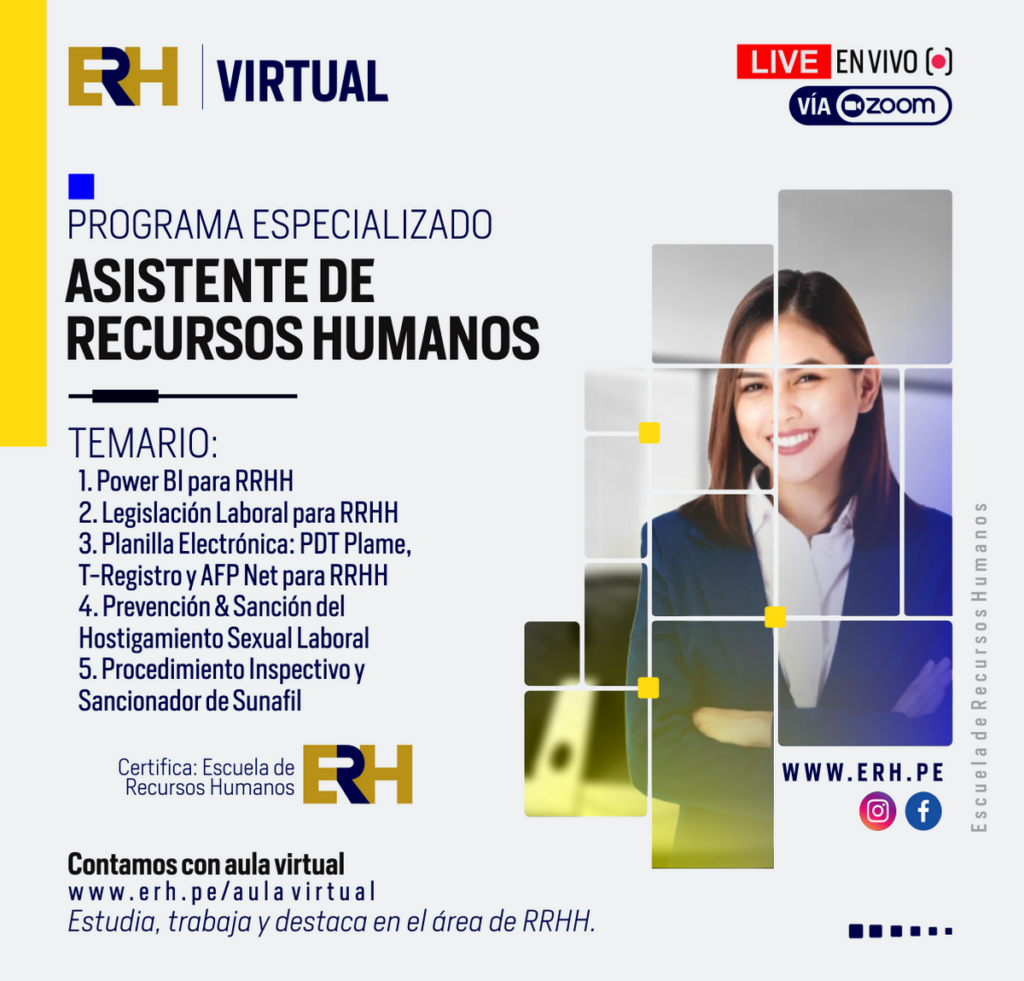 2. Duración: 2 meses de clases en vivo online vía Zoom. Estudia 05 cursos de RRHH: Planillas para RRHH, Legislación Laboral para RRHH, Subsidios para RRHH, PDT Plame, T-Registro y AFP NET para RRHH, Prevención y Sanción del Hostigamiento Laboral.